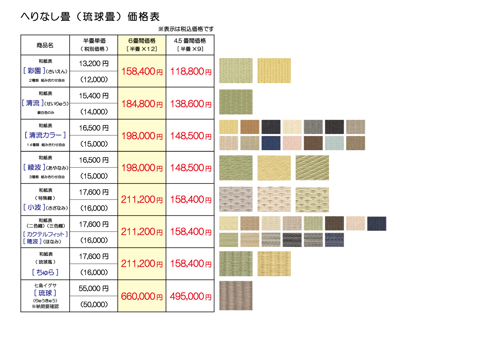 参考に「畳おもて」の写真を載せましたが、お電話を一本いただければ実際の「畳おもて」と「へりの見本」を持ってご都合の良い日にお見積りに伺います。