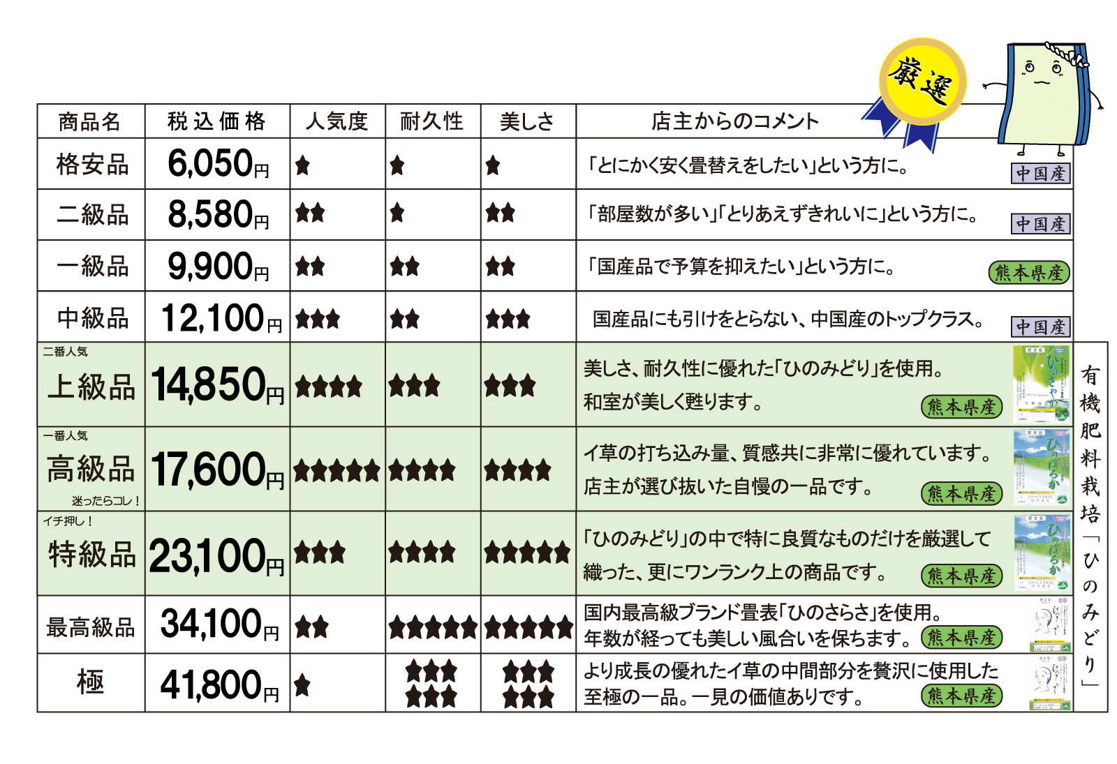 使用する畳おもて(表面のゴザ)によって金額が変わってきます。